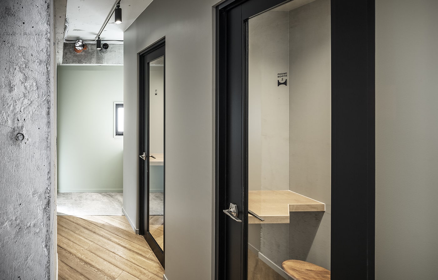 個室区画は4区画のみ。全体の1/3はラウンジで構成。会議室も1室用意しています。館内はWi-Fiを完備しており、共有スペースには心地よい音楽。コーヒーなどのフリードリンクも無料でご提供可能。また、常勤スタッフが皆さんのビジネスをサポートします。