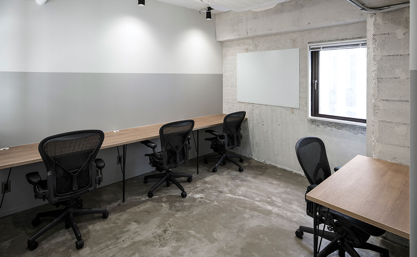 予約制の8名用ミーティングスペースをご用意。面接など、ラウンジでは対応しにくい打ち合わせにご活用ください。室内にはホワイトボードをご用意しています。